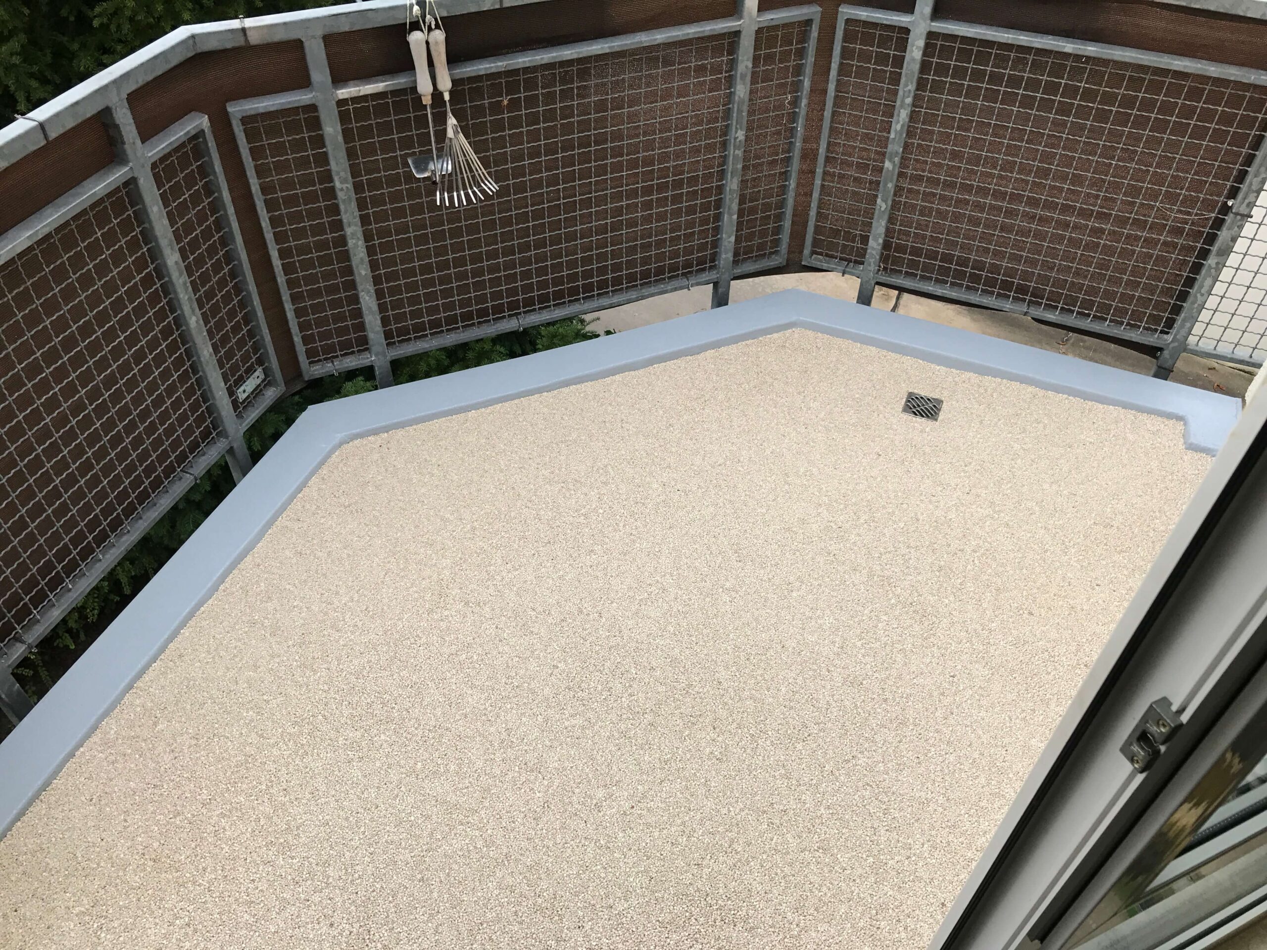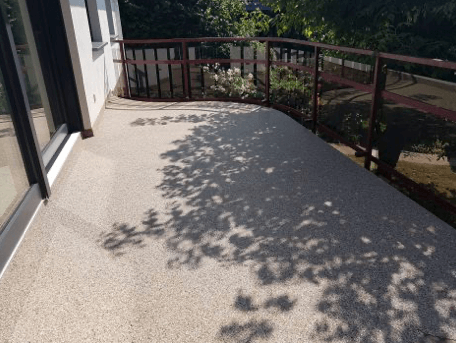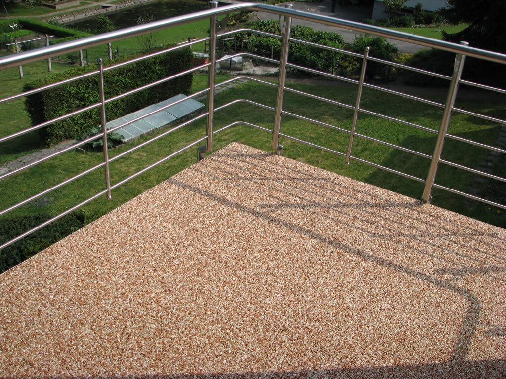 Połączenie marmurowego żwiru i wysokiej jakości wykonania sprawia, że balkon staje się miejscem relaksu. Barwna powierzchnia, delikatny połysk kamieni i komfort chodzenia tworzą przestrzeń, w której chce się przebywać.
